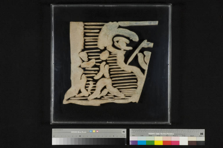 Esili figure stilizzate affrontate, un occhio e altri motivi decorativi, realizzate in legno di balsa a traforo. La porzione in alto a destra è tinteggiata in blu; in alto a sinistra iscrizione in corsivo con pastello blu "6 copie". L'opera è racchiusa entro una teca in plexiglass.