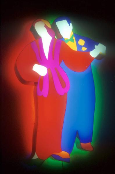 Coppia di danzatori a figura intera, affiancati, si tengono per mano.
