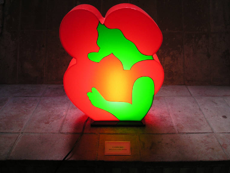 Scultura luminosa, lampada da tavolo: due amanti a mezzo busto, abbracciati si baciano. Le figure sono inscritte in un cuore verde e viola su un lato e arancio e verde sull'altro.