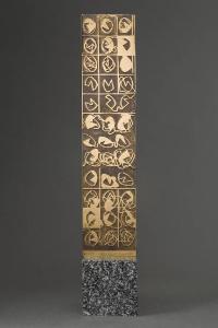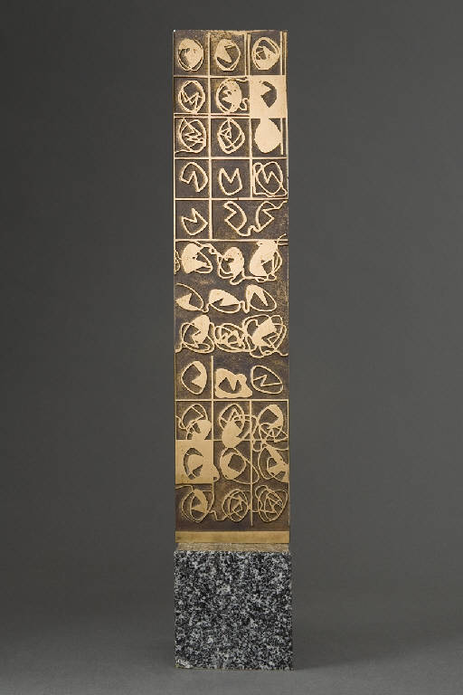 Monolito: stele verticale decorata da moduli reiterati di forma trapezio-ovoidale a bassorilievo, tipici della produzione del Maestro. Il decoro si ripete in sei fasce sovrapposte, su una faccia leggermente convessa con moduli di dimensioni minori, mentre sull'altra faccia i moduli assumo maggiori dimensioni. La stele poggia su una base cubica in granito grigio lucidato.