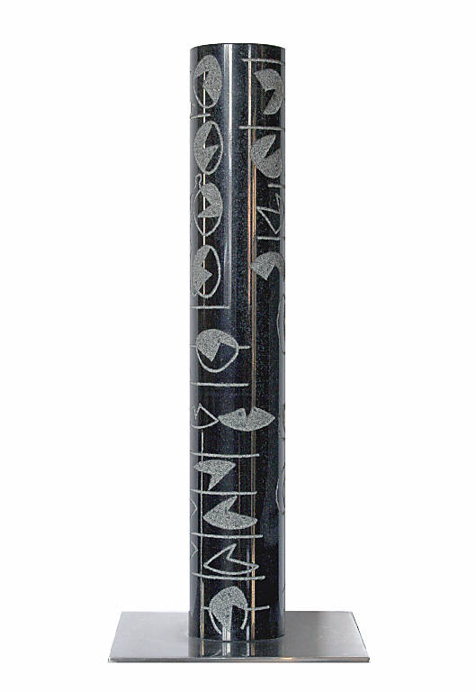 Monolito: elemento cilindrico verticale in granito inciso alla fresa e satinato, decorato da moduli reiterati di forma trapezio-ovoidale a bassorilievo, tipici della produzione del Maestro. I motivi astratti si alternano su tutta la superficie ad incisione e ad abrasione, creando un effetto chiaroscurale tra parti lucide e satinate. Poggia su una bassa base cubica in acciaio.