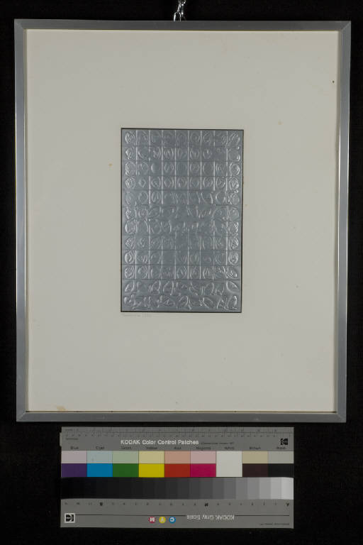 Al centro su un cartoncino argentato, a fingere una lastra metallica, una sequenza di moduli di forma trapezio-ovoidale, tipici della produzione del Maestro, resi a calcopressione, inseriti in una quadrettature. Cornice a listello e vetro.