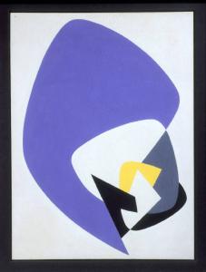 Monoforma, modulo trapezio-ovoidale, singolo, che occupa l'intera superficie, campito nei colori viola, giallo tenue e nero, su fondo bianco.