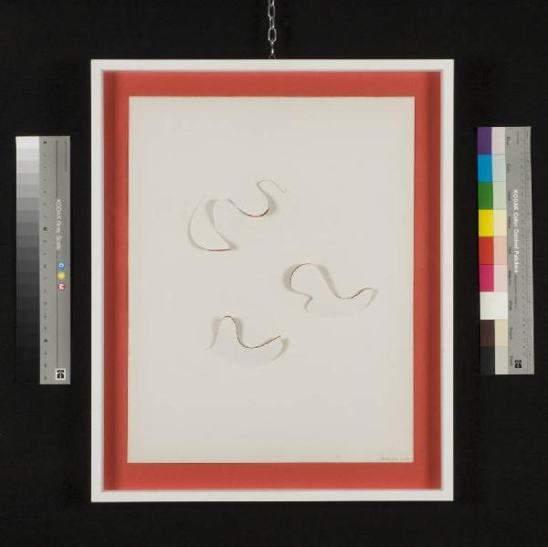 Su un cartoncino rosso di fondo si posiziona un ulteriore foglio bianco, di minori dimensioni, sul quale si stagliano tre moduli trapezio-ovoidali, cari all'artista, ritagliati ed estroflessi, circondati da un graffito.