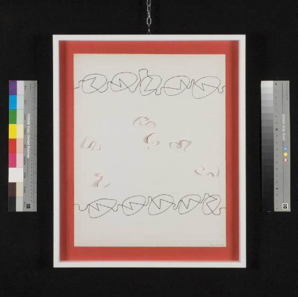 Su un cartoncino rosso di fondo si posiziona un ulteriore foglio bianco, di minori dimensioni, sul quale si stagliano due catene orizzontali con sequenza di moduli trapezio-ovoidali, cari all'artista. Tra le due catene ono compresi gli stessi motivi ripetuti, ritagliati ed estroflessi, arricchiti da un graffito.