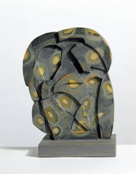 Scultura astratta bifrontale dipinta a finto marmo nei toni del verde acqua. Lungo il bordo tasselli di legno.