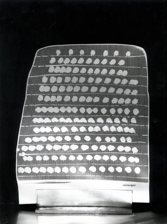 Scultura sottilissima in lamina d'acciaio fotoincisa con motivi geometrici, poggiante su base rettangolare. La lamina è decorata da tredici sottili linee orizzontali che dividono la superficie con sequenze di motivi puntiformi. L'opera è l'esemplare 23 di 30.