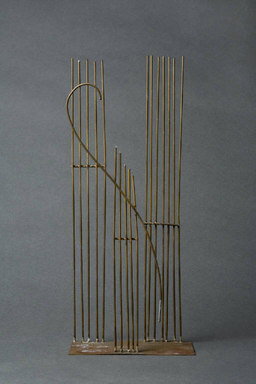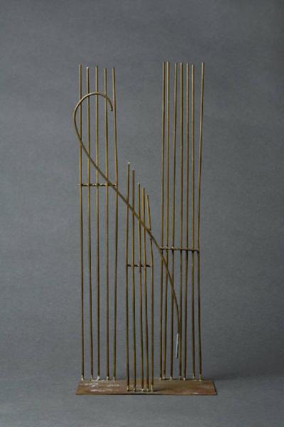 Tre serie di aste verticali poggiano su una base rettangolare. Il gruppo centrale di altezza minore è caratterizato da un motivo ad "esse".