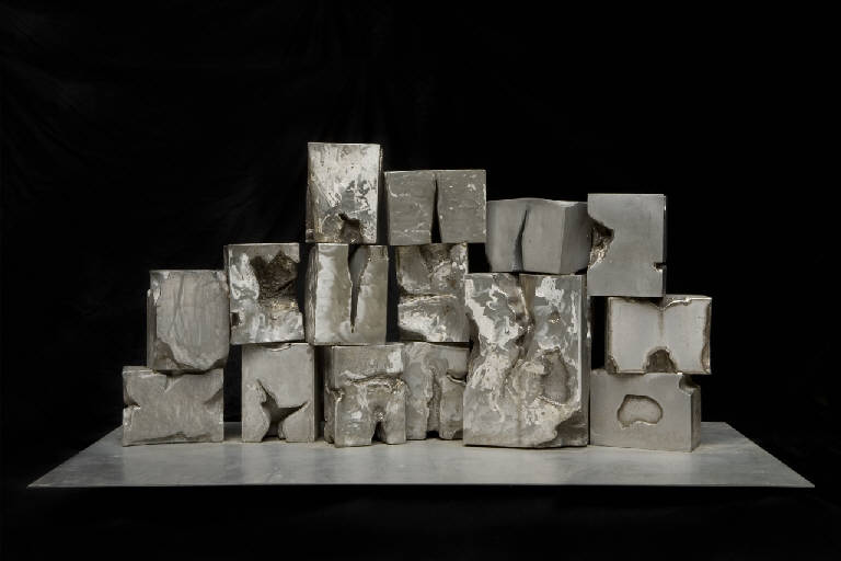 Serie di parallelepipedi con tagli, fori e incrinarture sovrapposti e affiancati a formare un muro. Il muro poggia su una sottile lastra di acciaio.