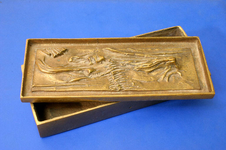 Scatola in bronzo con coperchio, fa parte di una serie di 4 scatole realizzate a 4 mani dai 2 fratelli Giò e Arnaldo Pomodoro. Sul coperchio motivi astratti a basso e alto rilievo.
