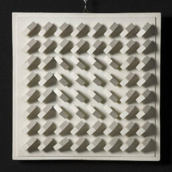 Scultura lignea caratterizzata da una sequenza di piccoli prismi con una sola facca tinteggiata in giallo fosforescente, fissati alla superficie lignea mediante viti.