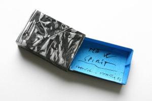 Scatola da fiammiferi dipinta all'esterno con effetto marmorizzato nero, argento e graffito. L'interno è dipinto in azzurro intenso e presenta un'iscrizione a china nera.