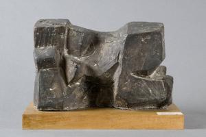 La scultura rappresenta una figura femminile accovacciata con occhio, naso e bocca incisi.