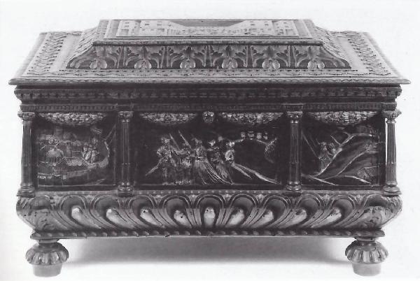 Cassetta recante le storie di Giuditta lungo i lati e sorretta da quattro piedi torniti lumeggiati d'oro.