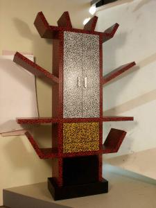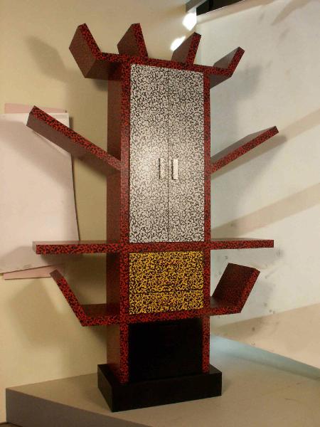 Struttura in legno e laminato plastico composta da base su cui poggia il corpo principale comprendente cassetti e ante e dal quale fioriescono mensole, ai lati e sulla sommità.