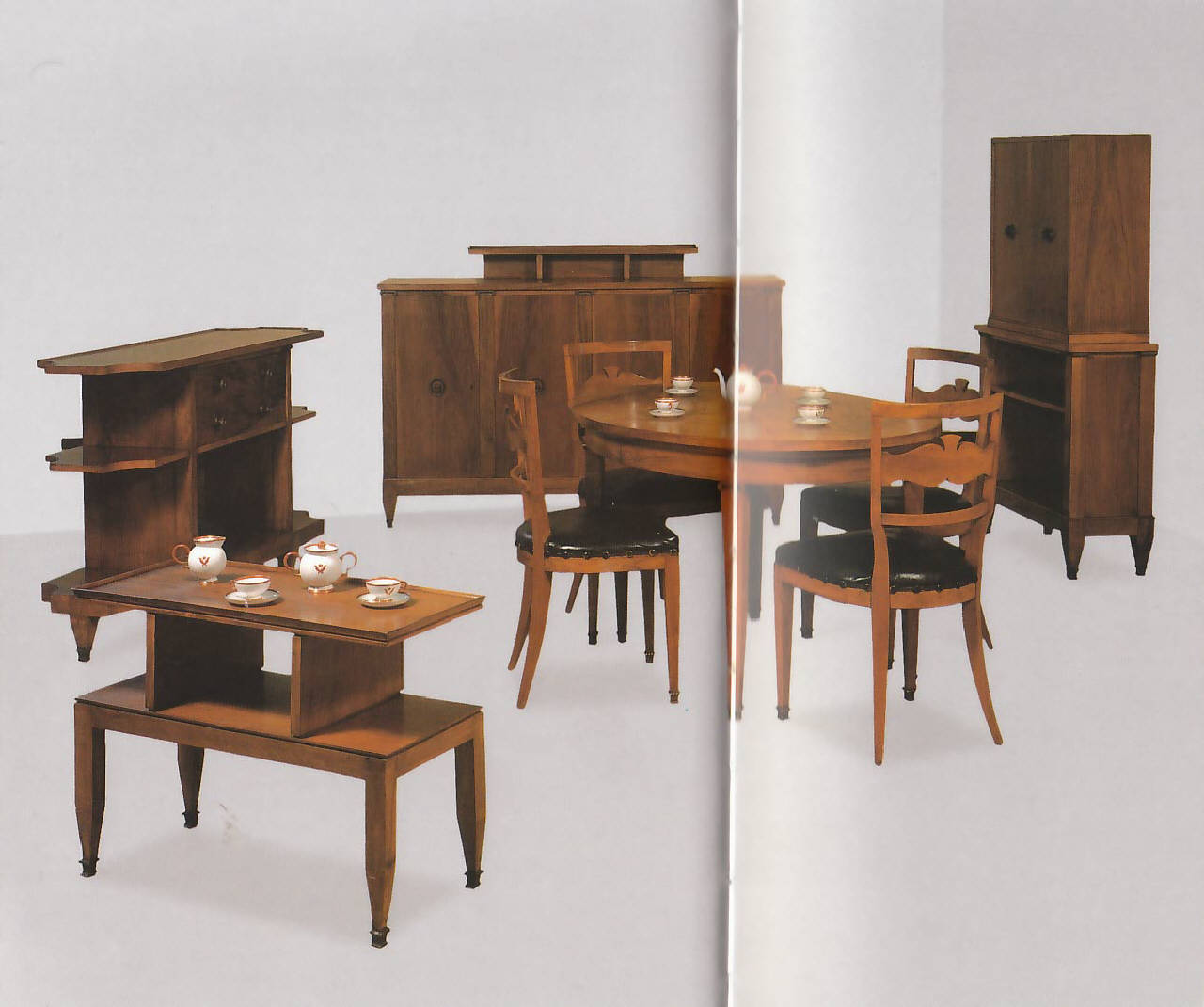 Sala da pranzo realizzata in legno di noce con piedini e pomoli con corona circolare e piccoli capitelli ionici in ottone. E' costituita da undici pezzi: un mobile bar e due corpi sovrapposti, un tavolo da pranzo ovale su gambe di sezione quadrata rastremate verso il basso, sei sedie, un buffet a quattro ante un controbuffet a tre ripiani e un tavolino da tè.