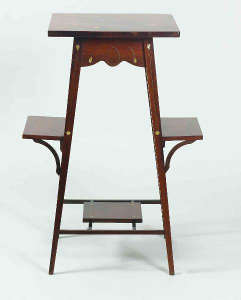 Tavolino a tre mensole: le due laterali rettangolari e sporgenti ai lati e una quadrata più piccola. Sono fissate alle quattro gambe da esili elementi di raccordo mistilinei. Il piano del tavolino è decorato da esili steli filiformi metallici intrecciati che collegano tra loro piccoli fiori intarsiati in madreperla.
