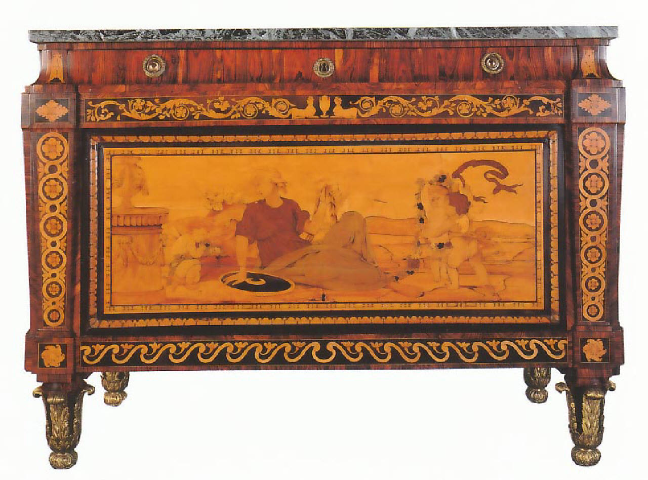 - NOTIZIE STORICO CRITICHE Nonostante il mobile sia stato sottoposto in epoca imprecisata ad un drastico restauro che ne ha alterato la struttura con l'aggiunta dell'alzata (sono stati inoltre sostituiti i piani di marmo e le maniglie di bronzo), esso rappresenta uno dei capolavori realizzati da Giuseppe Maggiolini. Come riporta Alvar Gonzàlez-Palacios, che del mobile ha condotto un esauriente studio, il cassettone faceva probabilmente parte di un insieme formato da un altro esemplare di forma (se si eccettua l'alzata) e dimensioni uguali al nostro e già di proprietà delle contessa Bice Belgioioso Greppi componente della stessa famiglia da cui il Morazzoni afferma essere pervenuto il cassettone delle Civiche Raccolte. Per eseguire il grande pannello centrale il Maggiolini si servì di un cartone disegnato dal giovane Appiani e in seguito riutilizzato dall'artigiano anche per un altro cassettone recentemente passato sul mercato antiquariale, mentre per intarsiare le decorazioni a racemi di foglie d'acanto, nastri intrecciati e borchie egli si avvalse di incisioni, raffiguranti vari tipi di ornati, tratte dai principali repertori a stampa francesi e diffuse in tutta Europa a partire dalla seconda metà del Settecento. Per quanto riguarda il motivo decorativo intarsiato sulla fascia sottostante il cassetto, esiste un disegno preparatorio conservato nel Fondo Maggioliniano del Castello Sforzesco (Inv. n. C145 bis).\n\nRispetto alla foto presente nel catalogo di Colle (1996) il mobile attualmente esposto in sala XVI appare privo dell'alzata (De Palma, 2009).\n\nDalla scheda inventariale dattiloscritta risulta che durante un restauro, in una nicchia sigillata entro una gamba è stato trovato un cartiglio recante la scritta: CARLO DEFELIPI E CARLO MAGIOLINO E' GIUSEPPE MAGIOLINO [...] F [...] [...]GIO PARABIAGO