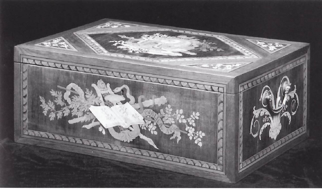 - NOTIZIE STORICO CRITICHE La cassetta fu eseguita, probabilmente verso la fine del Settecento, da Giuseppe Maggiolini per un ricco committente che volle far apporre le iniziali "W" del suo nome all'interno del coperchio. Tali iniziali, individuate dal Morazzoni anche su una scrivania attualmente conservata in una collezione privata e presenti in alcuni disegni dell'ebanista, sono state sciolte tenendo presente il nome del banchiere Vonwiller. Si potrebbe però avanzare l'ipotesi che i due arredi, così come un cassettone ora nella Villa Reale di Strà, siano stati commissionati al Maggiolini dal ministro plenipotenziario J. Wilczeck, posto dall'imperatore Giuseppe II accanto all'arciduca Ferdinando nel governo del territorio lombardo. Le scritte "Salus publica aus." e "Ars longa vita brevis" potrebbero infatti essere riferite all'importante ruolo pubblico del ministro e alla sua campagna riformatrice nel campo sia civile che artistico.\nPer l'esecuzione degli intarsi che ornano le superfici della cassetta, di cui il Beretti ha pubblicato delle varianti ora in collezione privata, esistono i disegni preparatori realizzati con tutta probabilità dal Levati e inventariati ai nn. A215, B495, B139, C149 e C66 del Fondo Maggioliniano presso il Gabinetto dei Disegni del Castello Sforzesco.