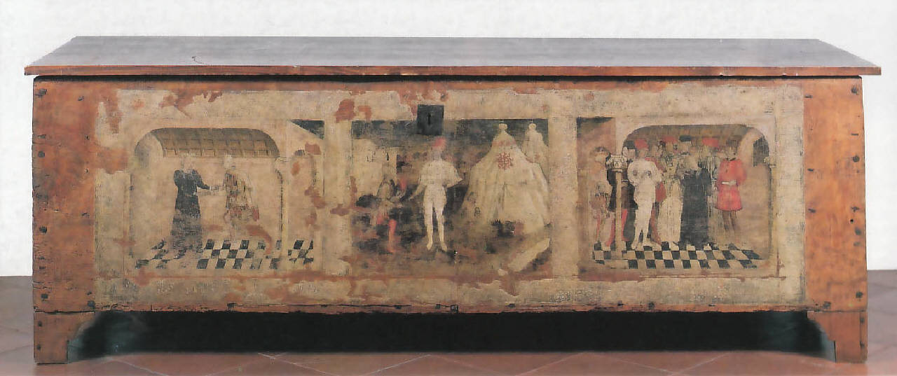 - NOTIZIE STORICO CRITICHE Il mobile, che risulta frutto di una ricomposizione ottocentesca, forse operata dai precedenti proprietari, i fratelli Mora, reca sui fianchi due stemmi (di cui uno appartenente alla famiglia cremasca dei Benzoni) dipinti su tavole, in seguito adattate alle misure del pannello frontale; mentre l'emblema della Ruota Infuocata, detta anche la Croce di Mesocco, concesso dal papa Alessandro V ai Trivulzio, si vede impresso sull'armatura, sulle tende e sulla veste del paggio di Collatino. Con tutta probabilità il pannello frontale con la storia di Lucrezia, già attribuito alla bottega dei Bembo, e più in generale da Winifred Terni de Gregory ad anonimi pittori cremaschi, fu eseguito intorno al terzo decennio del Quattrocento per essere inserito nell'arredamento di una camera nuziale. Al dipinto, ampiamente restaurato, furono infatti aggiunti posteriormente, oltre ai due citati pannelli laterali, anche i piedi a mensola e, al centro, la toppa per la chiave.