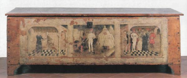 Cassone dipinto, sul fronte, con tre scomparti in cui sono narrati gli eposodi della storia di Lucrezia Romana. Nel primo scomparto: Lucrezia, dopo essere stata oltraggiata da Sesto Tarquinio, invia un servo al marito Collatino. Nello scomparto centrale: il servo giunge da Collatino riferisce della violenza subita dalla sua padrona. Nel terzo scomparto: il suicidio di Lucrezia. Il mobile reca sui fianchi due stemmi, mentre nel pannello centrale è presente lo stemma della Ruota Infuocata o Croce di Mesocco.