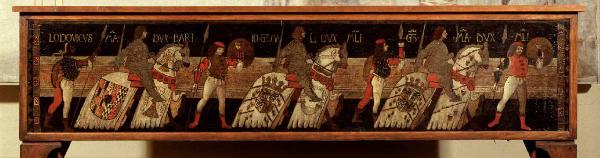 - NOTIZIE STORICO CRITICHE L'attuale mobile è frutto di un rimontaggio novecentesco che utilizzò un frammento rinvenuto, ancora montato in forma di cassone, e acquistato da Pietro Ghinzoni nel 1877 in un paese nei pressi del lago di Como per farne poi dono, nel 1893, al Museo. Da quanto riferisce lo stesso Ghinzoni, che compilò un accurato studio sull'arredo, il cassone si doveva trovare in cattivo stato di conservazione tanto da indurre il nuovo proprietario a scomporlo tenendo e restaurando la sola parte frontale dipinta, che risultava anche la meglio conservata. La tavola rappresenta i duchi di Milano Galeazzo Maria Sforza, suo figlio Gian Galeazzo e il duca di Baii Ludovico Maria Sforza fratello del primo, zio e tutore, del secondo. Ciascun cavaliere è accompagnato da uno scudiero ed è contrassegnato, oltre che dagli stemmi posti sulle gualdrappe, dal relativo nome. Il Ghinzoni ritiene che il cassone sia stato eseguito tra il 1479, anno in cui Ludovico Maria Sforza fu fatto duca di Bari, e il 1494, quando il Moro divenne duca di Milano. E più precisamente nel 1488 allorché Chiara Sforza, figlia di Galeazzo Maria, andò sposa a Fregosino Fregoso figlio del doge di Genova Paolo, spiegando così il fatto che assieme ai ritratti del padre defunto e del fratello compaia qui anche quello dello zio che combinò tale matrimonio per assicurarsi il possesso di Genova.