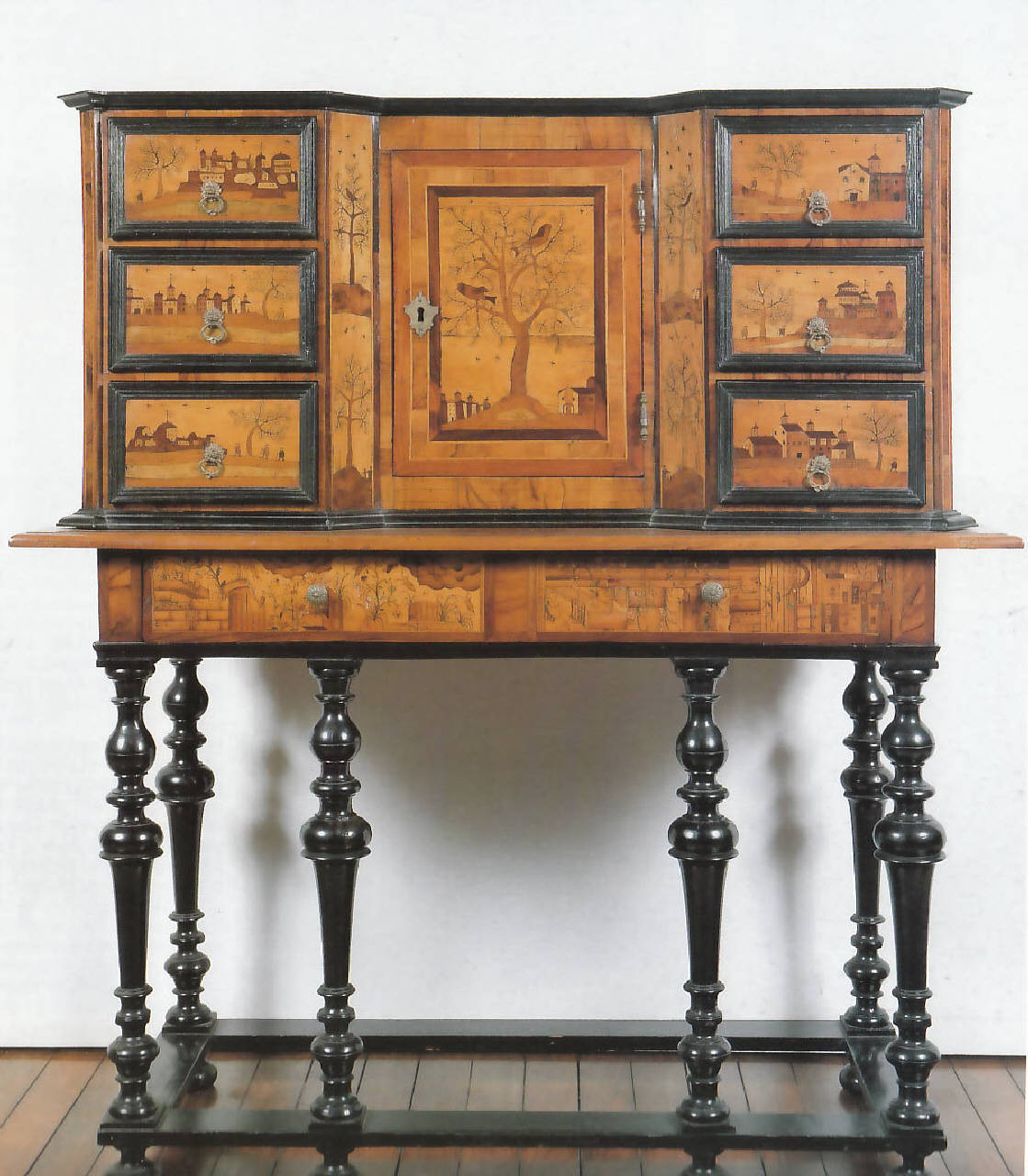 Stipo con sportello centrale e cassetti laterali (tre per lato) decorati ad intarsio.