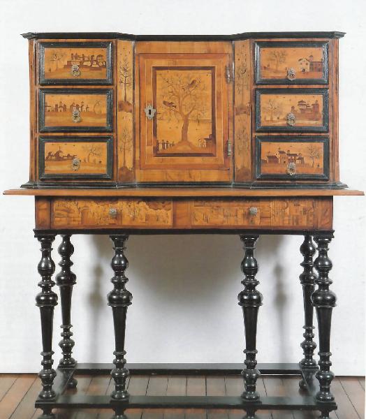 - NOTIZIE STORICO CRITICHE Lo stipo poggiava sopra un tavolo con gambe tornite e cassetto decorato con una tarsia raffigurante delle rovine di edifici classici. Al mobile fu aggiunto un supporto creato durante la seconda metà dell'Ottocento utilizzando un frammento intarsiato della fine del XVII secolo.\n\nAttualmente il mobile è esposto senza il supporto [De Palma].