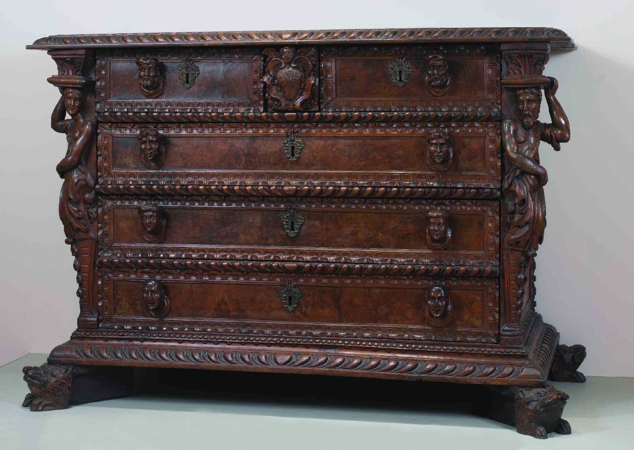 Cassettone sorretto cinghiali (?). E' composto da conque cassetti decorati da teste umane a rilievo. Agli angoli anteriori, due cariatici.
