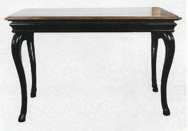 Piano di tavolo montato su un supporto neosettecentesco decorato con intarsi geometrici.