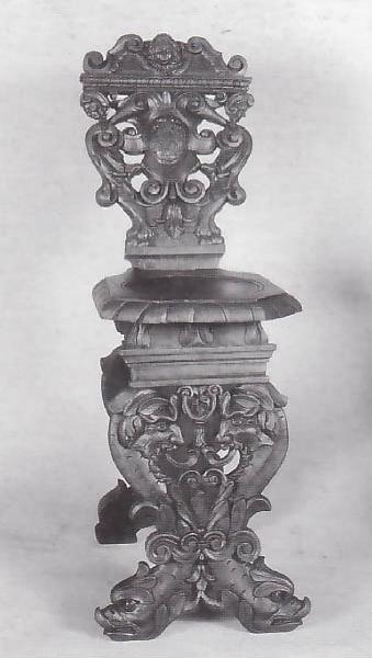 - NOTIZIE STORICO CRITICHE Lo sgabello, che presenta una struttura simile a quella degli esemplari cinquecenteschi toscani e veneti, fu realizzato durante la seconda metà dell'Ottocento. Sgabelli simili al nostro esemplare sono stati intagliati per i duchi di Parma intorno al 1850 su disegni dell'architetto Paolo Gazola.