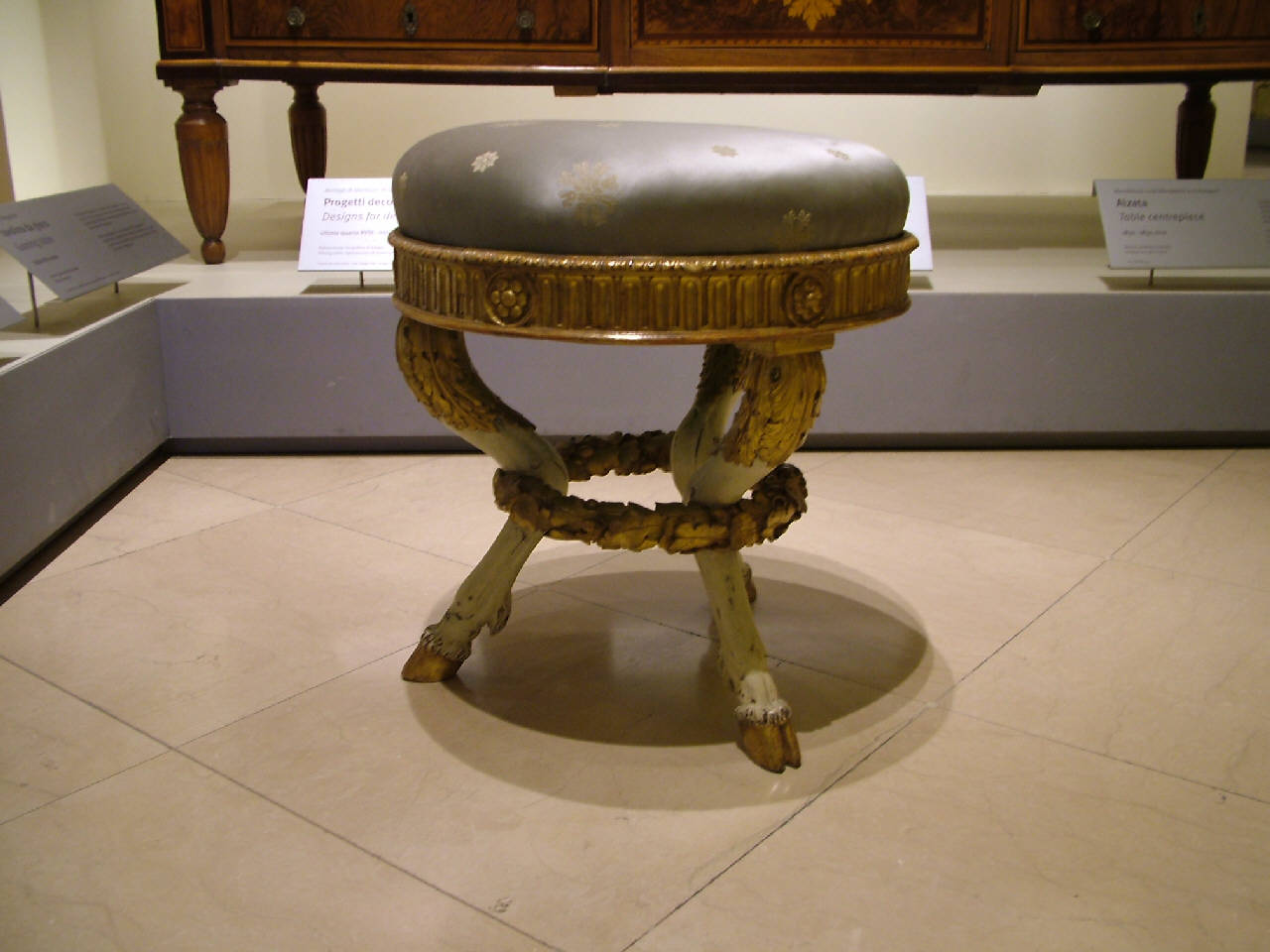 - NOTIZIE STORICO CRITICHE Riprodotto alla tavola VI del volume in folio intitolato Alcune decorazioni di nobili sale, dato alle stampe da Giocondo Albertolli nel 1787, lo sgabello, insieme ad un faldistorio per l'arcivescovo Filippo Maria Visconti, è l'unico mobile eseguito su disegni dell'Albertolli che si sia conservato fino ad oggi. Come notava Alvar Gonzàlez-Palacios, il celebre ornatista milanese si sarebbe rifatto, nell'ideare il presente sgabello (che insieme ad altri tre esemplari era stato destinato ad arredare una delle sale della Villa Reale di Monza), a modelli antichi, quali ad esempio i tripodi romani, aggiornandoli al gusto Luigi XVI francese. Il Rava nel 1964, infine, ha reso nota una variante dello sgabello milanese allora in collezione privata francese.