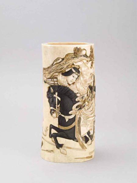 Sezione di zanna di elefante cava, decorata sull'esterno (a incisione, intaglio, inchiostratura e doratura) con una scena continua in cui un guerriero giapponese a cavallo di un destriero nero mette in fuga una coppia di uomini brandendo un'arma in asta.