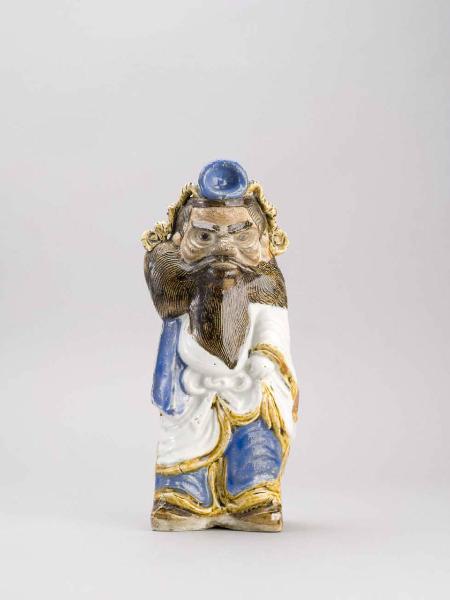 Statuetta di Shoki ad uso portafiori (da inserire in un piccolo foro posto sulla sommità) raffigurante una figura maschile barbuta, vestita di un'ampia tonaca allacciata in vita. La ceramica è dipinta in blu, bianco, ocra e varie tonalità di marrone, quindi invetriata.