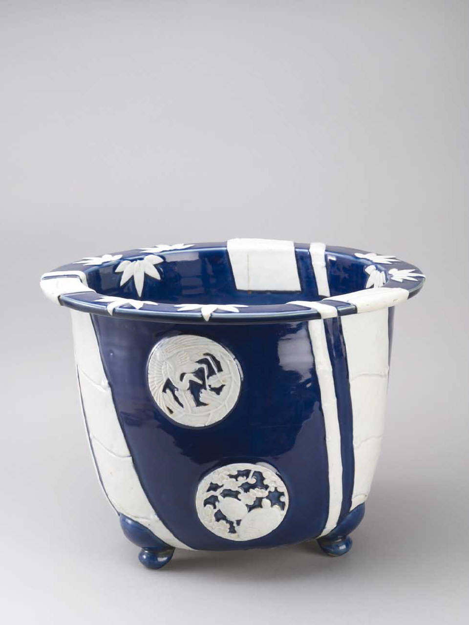 Vaso da fiori per giardino a sezione circolare, posante su tre piedini, con bocca dalla tesa piatta. Sull'esterno, dipinto in bianco e blu, è presente una decorazione a rilievo con fusti fogliati di bambù (take) e motivi circolari con elementi naturali di vario tipo all'interno.
