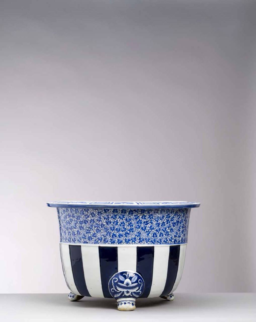 Vaso da fiori per giardino a sezione circolare, posante su tre piedini, con bocca dalla tesa piatta. Sull'esterno, dipinto in bianco e blu, è presente una decorazione divisa in due registri paralleli: in alto motivi di girali fitomorfi, in basso bande verticali parallele, in alternanza bianco e blu; anche i piedi sono ornati da motivi floreali stilizzati.