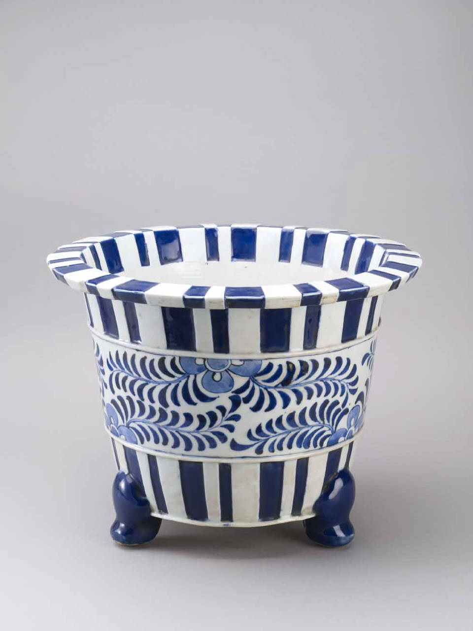 Vaso da fiori per giardino a sezione circolare, posante su tre piedi con la punta rivolta verso l'esterno; sulla bocca si apre un'ampia tesa piatta. La decorazione, dipinta sull'esterno in blu e bianco, si svolge sul corpo con una serie di bande verticali, interrotta verso il centro del corpo da un'ampia fascia racchiusa da due bordini rialzati che corrono lungo tutta la circonferenza del vaso, decorata con un girale floreale stilizzato.