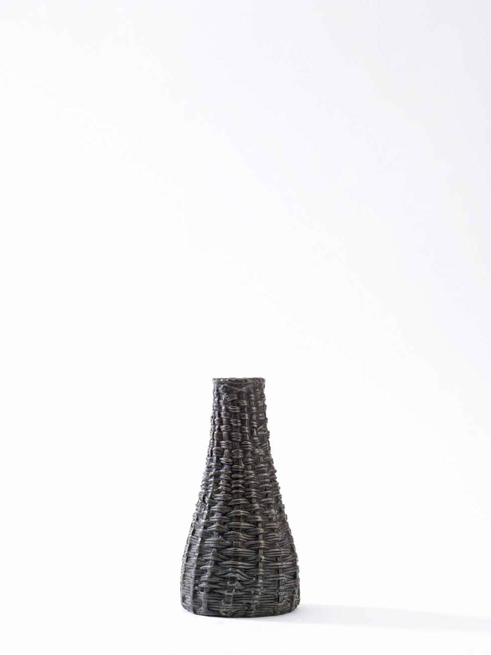 Vaso per fiori (hanaike) in bronzo, realizzato a cera persa, a foggia di canestro di vimini intrecciato con apertura circolare cordonata.
