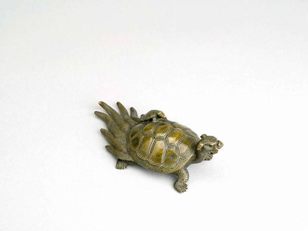 Bronzo decorativo realizzato con la tecnica chukin (fusione a stampo), raffigurante due tartarughe millenarie (minogame), la più piccola posata sul carapace della più grande.