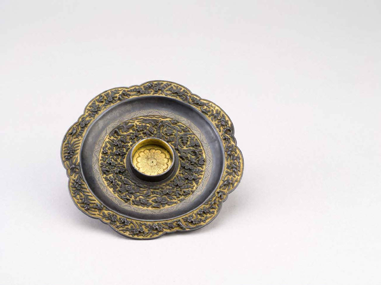 Vassoio in bronzo con contorno polilobato; al centro del fondo è presente una bordura rialzata circolare: forse era usata per sistemare una caraffa o comunque un contenitore per liquidi. La decorazione si compone di motivi floreali in leggero altorilievo.