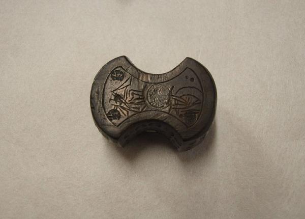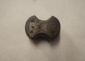 Peso per bilancia in metallo a foggia di fiocco ornato con tondi e fiori.