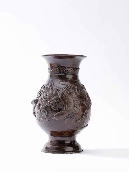 Vaso in bronzo ricoperto con vernice rossastra, con decorazione a rilievo di albero e rapace.