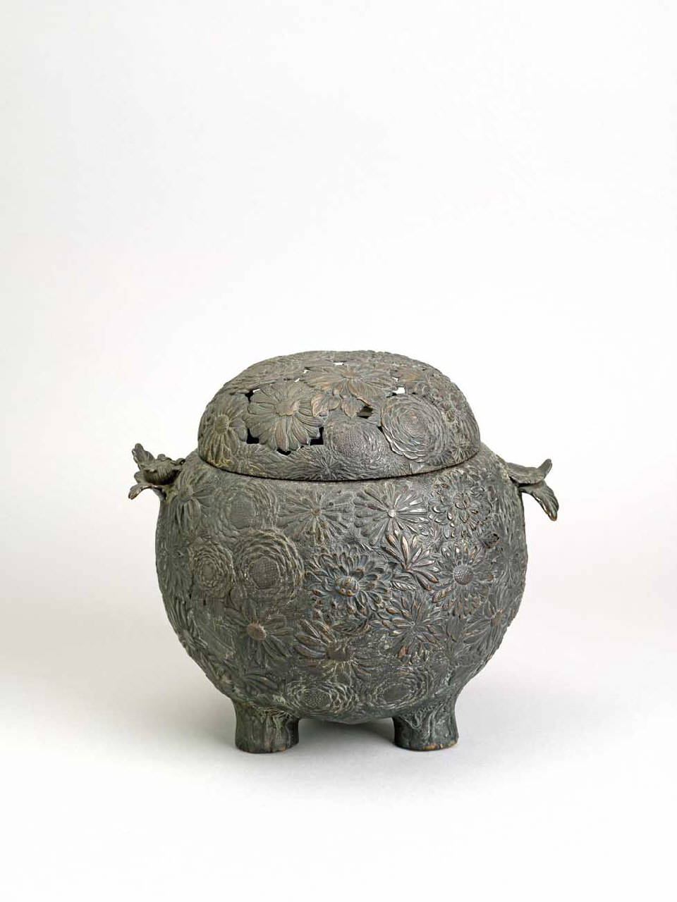 Bruciaprofumi (koro) in bronzo lavorato a fusione con stampo (chukun). Di forma sferica, è decorato sull'intera superficie esterna con corolle floreali in alto rilievo. I manici sono a forma di fiore con due foglie. Il coperchio presenta una larga apertura frontale ed è traforato in più punti. L'intero vaso poggia su tre piedini a tronco cilindrico.