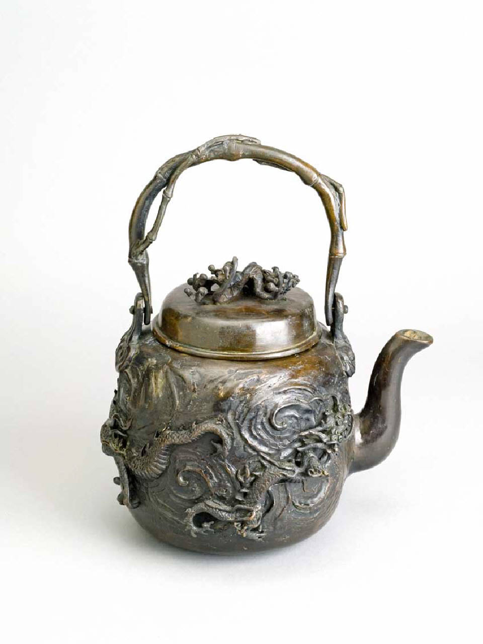 Contenitore per acqua (mizutsugi) in bronzo lavorato a fusione con stampo (chukin). Di forma cilindrica, presenta un manico semicircolare a foggia di tralcio di bambù piegato; il beccuccio è curvo, con la bocca rivolta verso l'alto; il coperchio, a sezione circolare, ha presa con piccolo tronco, fiori e volatili; il corpo è decorato con draghi (ryu) tra onde marine (nami).