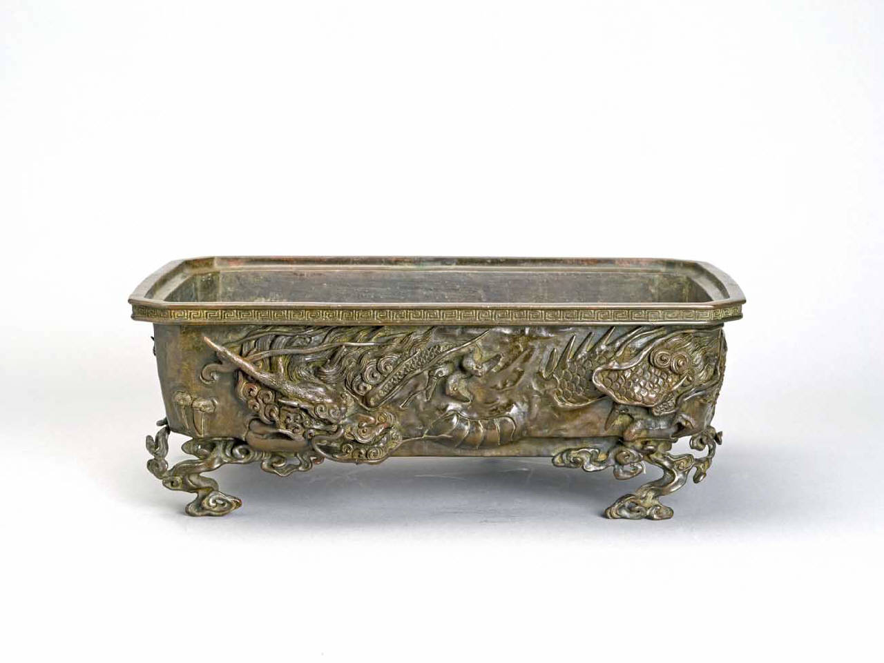 Vaso da fiori (suiban) in bronzo lavorato a fusione con stampo a cera persa (chukin). A sezione rettangolare, con l'orlo superiore ornato con una banda a meandro di greca, mostra sul corpo una decorazione in accentuato alto rilievo raffigurante un drago (ryu) tra le nuvole (kumo). Poggia su quattro piedi posti negli angoli, a forma di nuvole.
