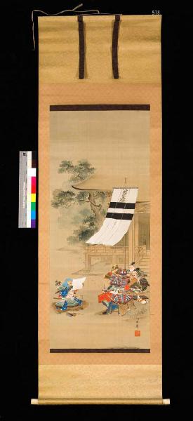 Il dipinto, nel formato del rotolo verticale da appendere (kakemono), è stato realizzato a inchiostro e colori su seta. Raffigura una scena con l'incontro tra quattro samurai: uno, seduto sulla sinistra, ha scritto una lettera e sembra leggerla al superiore che gli sta di fronte seduto su uno sgabello, accompagnato da due fidi, uno dei quali tiene nella mano destra un vessillo; su questo è presente un'iscrizione che fa riferimento ad Hachiman, il Dio della Guerra. Fa da sfondo all'incontro uno scorcio di padiglione con alberi. Ha cornice tradizionale in seta con bacchette in legno.