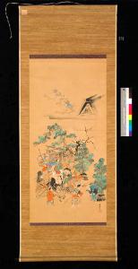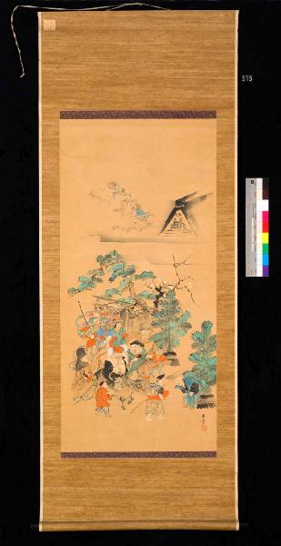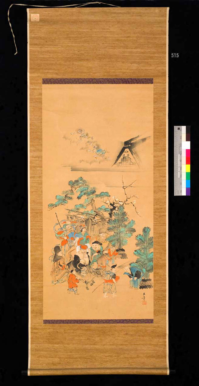 Il dipinto, nel formato del rotolo verticale da appendere (kakemono), è dipinto a inchiostro e colori su carta. Raffigura i Sette Dei della Fortuna (Shichifukuji) che, alcuni sulla groppa di animali e accompagnati da due inservienti, si recano in direzione di un uomo raffigurato in basso a destra. La scena è ambientata tra alberi di pino (matsu) e lo scorcio di un padiglione; in alto si vedono due demoni (oni) fuggire. Ha tradizionale cornice seta con bacchette in legno.