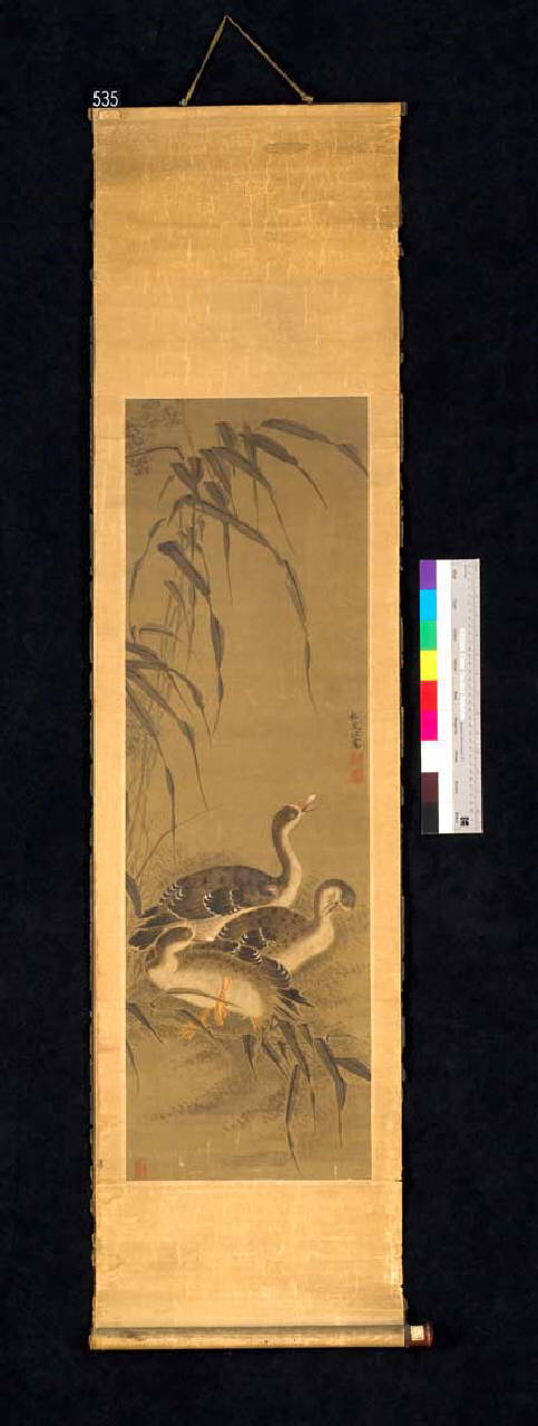 Il dipinto, nel formato del rotolo verticale da appendere (kakemono), è stato realizzato a inchiostro e colori su seta. Raffigura tre anatre posate con fusti fogliati di bambù (take) e altre piante. Ha tradizionale cornice in seta con bacchette in legno.