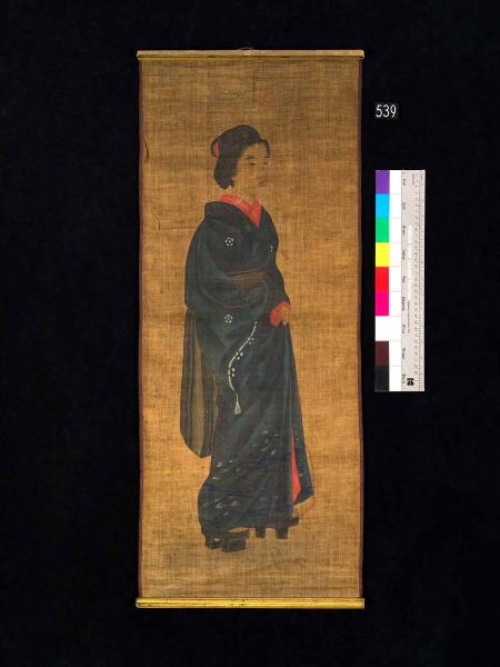Il dipinto, nel formato del rotolo verticale da appendere (kakemono), è stato realizzato a inchiostro e colori su seta. Raffigura una giovane dama stante vista di tre-quarti. Ha bacchette in legno.