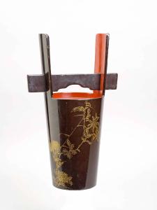 Contenitore per sake a corna (tsunodaru) in legno laccato di rosso all'interno e di nero (roironuri), mostra sulla superficie del corpo una decorazione di rami fioriti, resa mediante la tecnica del chinkinbori.